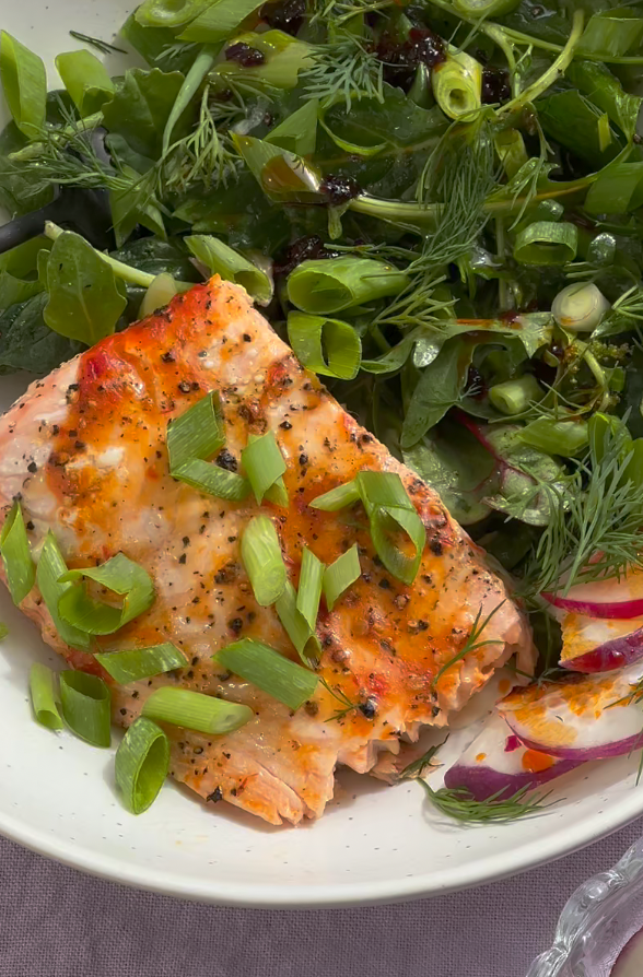 This is one that I wing every single time: I start with a couple Tbsp. of honey, soy or coconut aminos and 1 tsp. of miso paste, and whisk to combine. I’ll add in a few generous pours of sesame oil to thin it out and taste as I go, opting for more miso if it needs more tang, and more honey to even it all out. If I’m not pairing it with the spicy cucumbers, I’ll add a tsp. of gochujang paste to the glaze. Once it’s tasting nice and balanced, I add the salmon to a foil-covered sheet pan and evenly coat the fillets (1.5 lbs. or so sliced into a few even pieces: if you’re serving this with noodles and cucumbers, you won’t need a ton). Then I’ll roast in the oven at 350º for 14-19 minutes, checking until it’s reached around 130ºF internally.