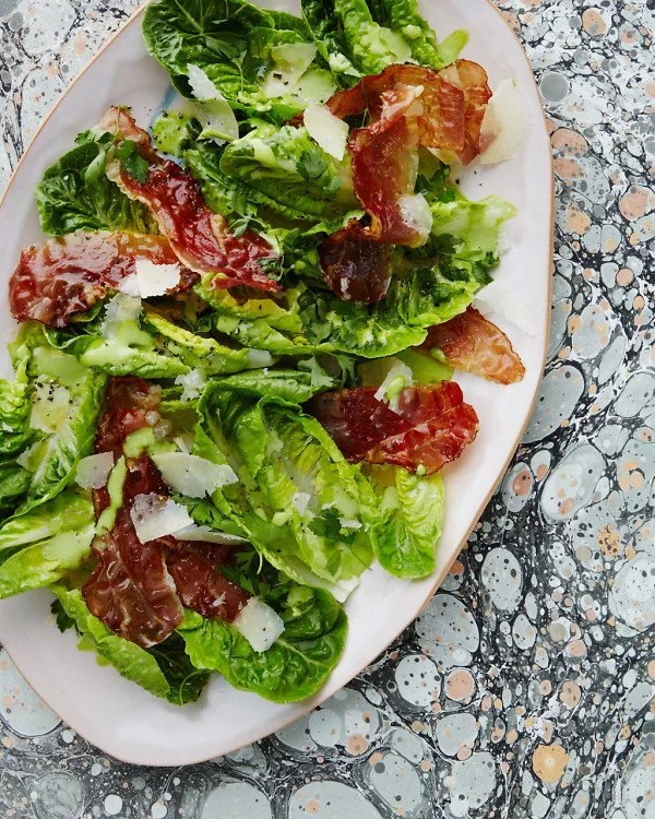 This is the salad to end all salads: sometimes I make it with the pancetta and sometimes I make it without. Either way, a lovely addition to this caesar is the spicy herby breadcrumb whose recipe you can find here.