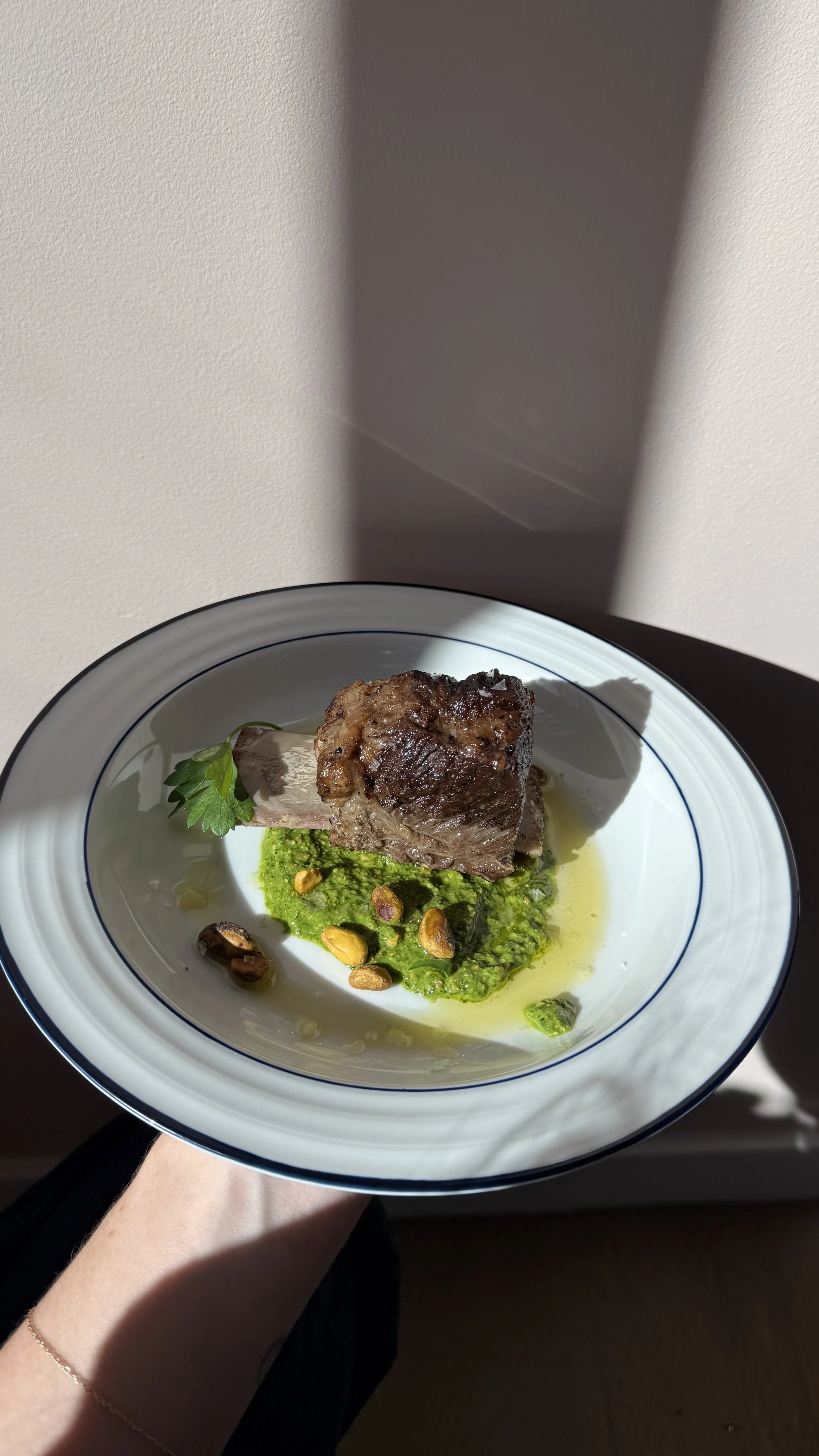 To serve: add a generous scoop of the herb sauce to a plate or shallow bowl, gently swiping it in a circle. Add the short rib on top, followed by a pinch of flaky salt, pistachios and a sprig of parsley or dill. I also added a drizzle of citrus finishing oil, which you can do if you’d like—enjoy!