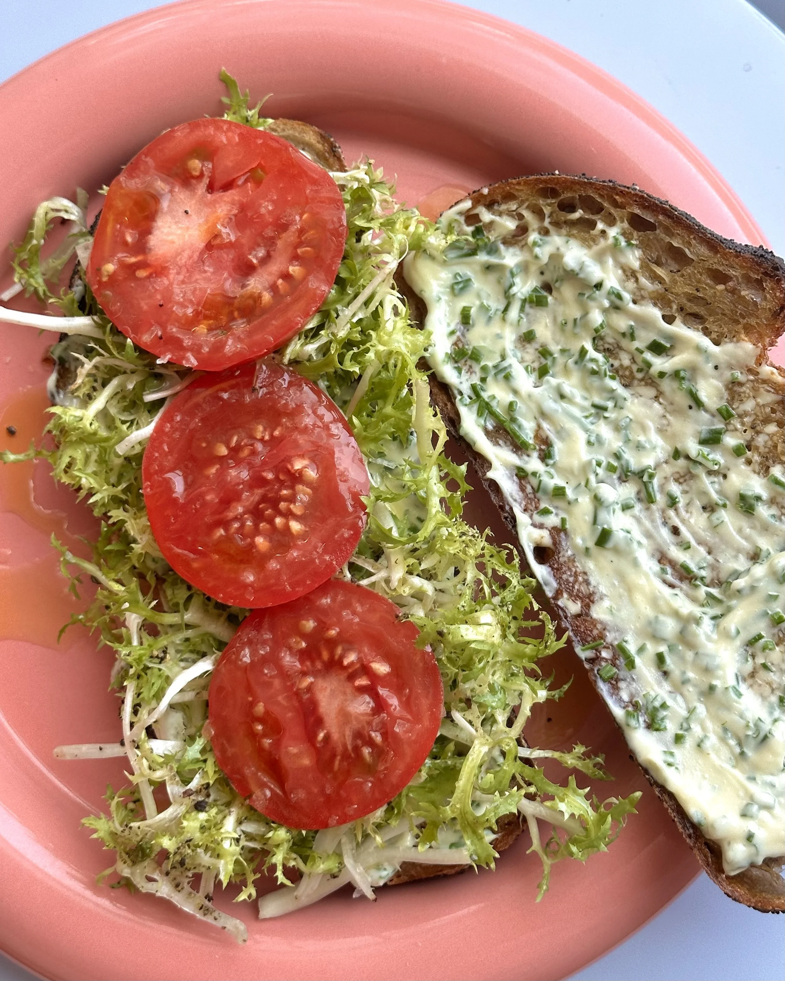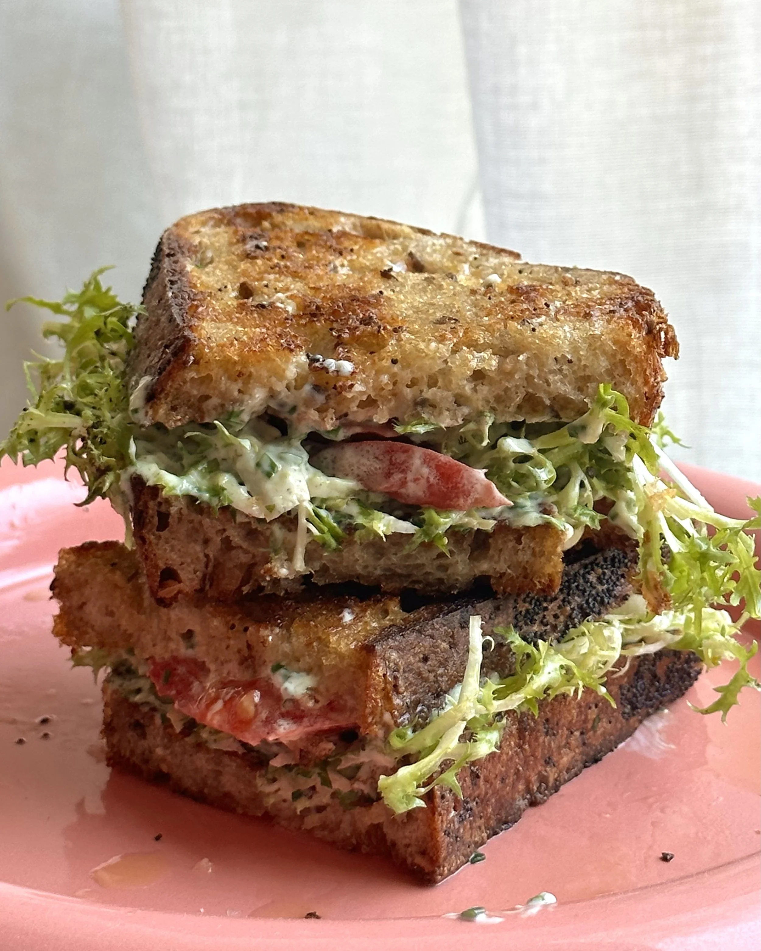 I was so hungry, and inevitably, spacey when I started making this sandwich that I completely forgot to cook the bacon and I didn’t even think about it until I was 75% done eating it. Despite the fact that my entire goal was to make a BLT, this was so delicious without bacon that I wanted to share it as it was. This sandwich is garlicky, herby, crunchy, buttery, slightly bitter with the friseé, and super sweet with perfectly ripe Japanese tomatoes. I love grabbing produce from Cookbook and they also have some of my favorite breads from Bub & Grandma’s— this one is their poppyseed loaf. 🥓🥬🍅