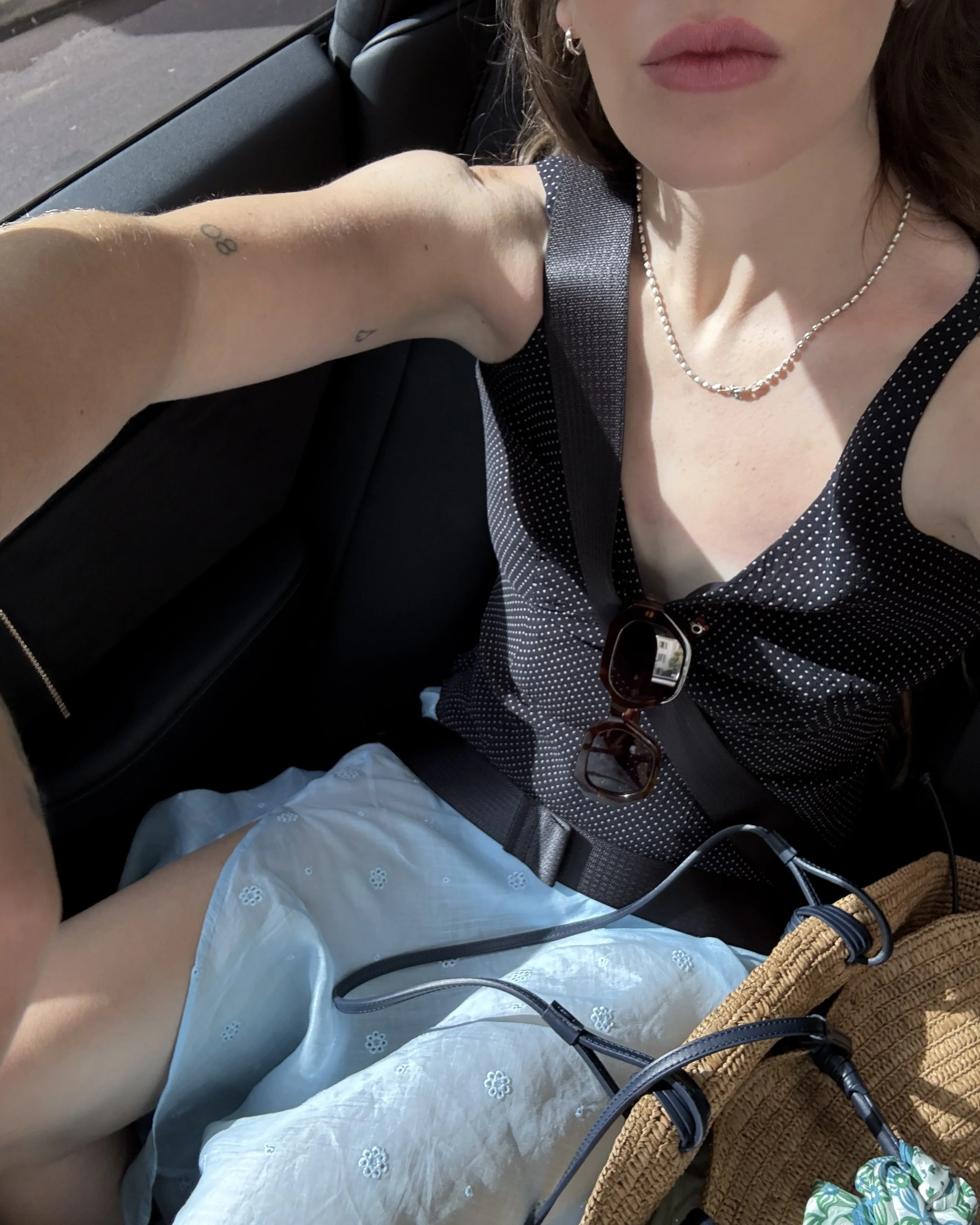 I opted for a vintage beaded bag and my Audette baguette, but primarily reached for my raffia tote since it could hold my camera, sunscreen, sunglasses, phone, and book all at once. I relied on vintage scarves to change up the look of my raffia bag day-to-day, and while I waited too long to decide on the Triton Belt, I would’ve brought it if I’d placed the order on time!